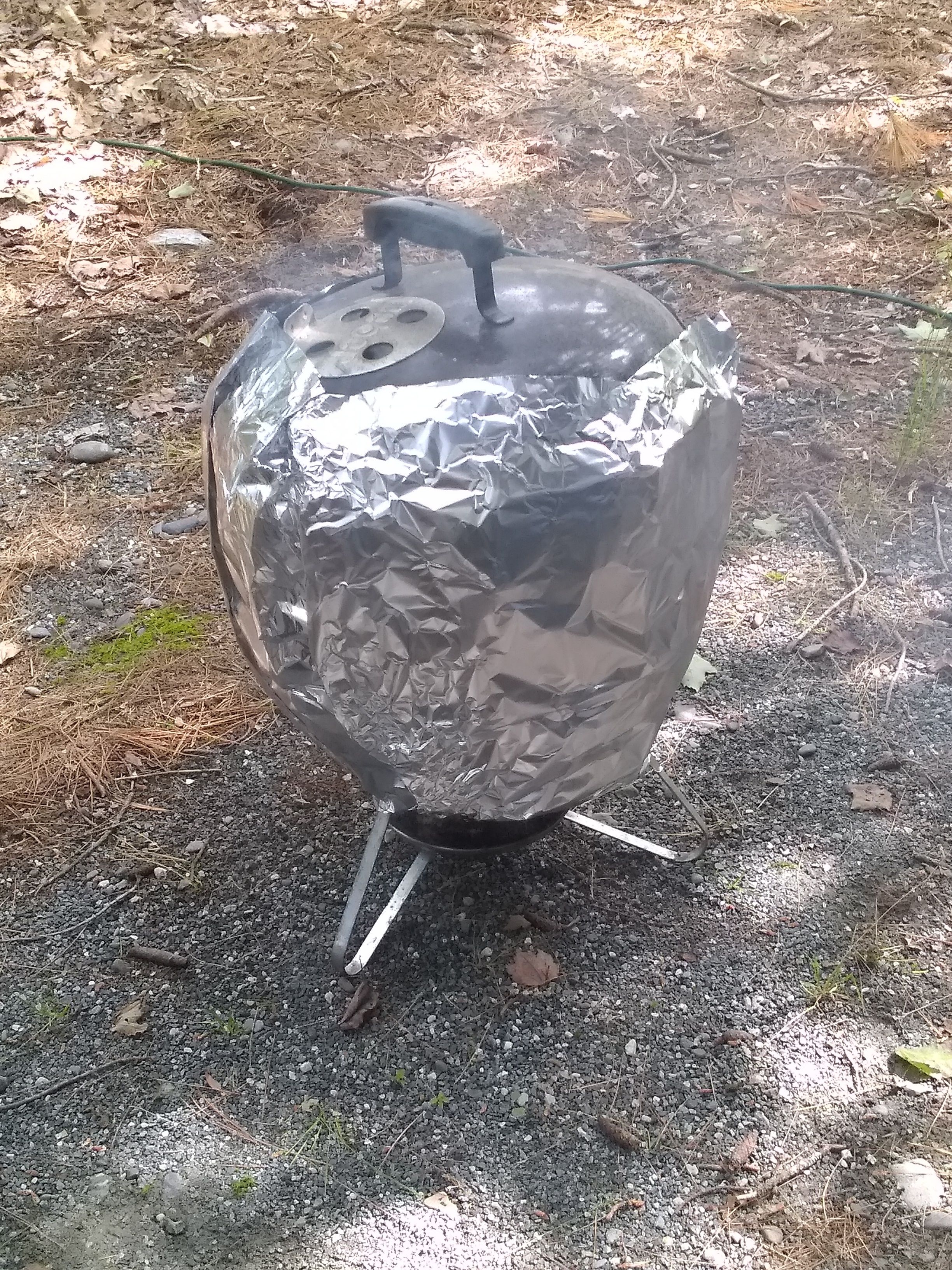 NOW - this works great if you have the big Weber or Green Egg charcoal grill. BUT with the little Smokey Joe I take 3 old vice-grip pliers and clamp them on the outer edge of the bottom half of the grill (spaced evenly) and place the lid on the tops of the pliers and wrap an appropriate length of large HD aluminum foil around the side of the grill. Works like a charm!!! and is a space saver!