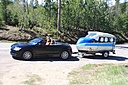 Made from a CESSNA CENTURION AIRCRAFT, YES A PLANE ! The wife ( Shelby) and i were looking for a travel trailer, no luck , and then just a trailer ... i found a new never used trailer on CL the owner told me it had something on it that MUST GO, So off i go to check it out, arriving the owner pulled back a barn door revealing a Cessna fusalage on a Harbor fright frame .. no nose, no tail, no wings .. and CHEAP .. the gears turning in my head on the long drive home.. within a few weeks we had a functional camper . Mahogony interior trimmed in cedar, carpeted , insulated, 110v with tv/dvd, bike rack, storage under and forward in the nose , and air conditioning. .. its an unique build with now 6000 miles and over a dozen states and campgrounds ..,last trip from NY to WY and back . Weighing in at around 900 lbs tows like a dream, very aerodynamic. Equipped with high speed tires , and outside outlets, awning and table .. no galley ( yet) ... looking forward to meeting others and we hope to make a couple meets this summer ..questions/comment? Email me! scg13803@yahoo.com.