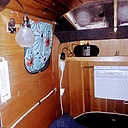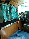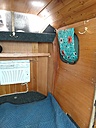 the copilots side also has a flip up table top made from a cedar chest, there is also a door that flipps up and locks . Going back, you can see the lamp , rear side window and rear outlet to air conditioner.
