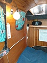 The rear section has a shelf with a hidden vent ( offset panel) going directly outside, and above this shelf, a window shelf, . Pilots rear side has hooks for hanging backpacks. This cabin is insulated, and we use reflextex cutout for all windows which are removable., we use them mainly for privacy as we get many peepers... finally the bed is 2 inch gel foam with a moving blanket on top to firm it up. And another 4 inch gel foam on that with sheets/ blanket. We have a vintage 110v heater and cooler , about 6000 miles so far. High speed tires, and weighs in at 970 to 1000lbs loaded. 140 tongue wt.