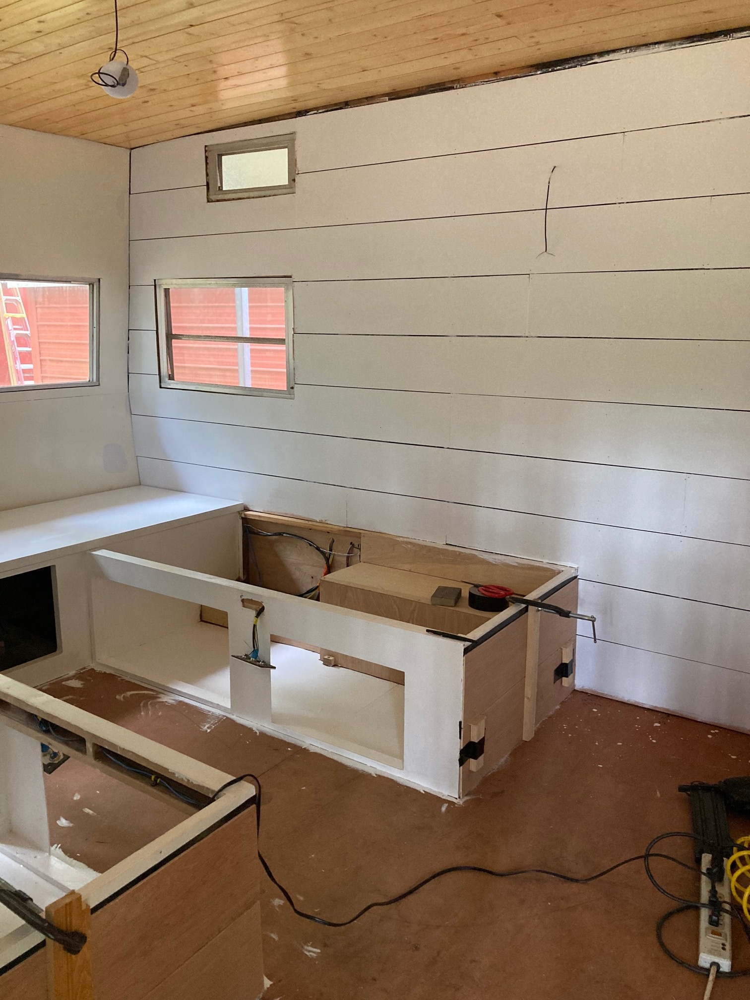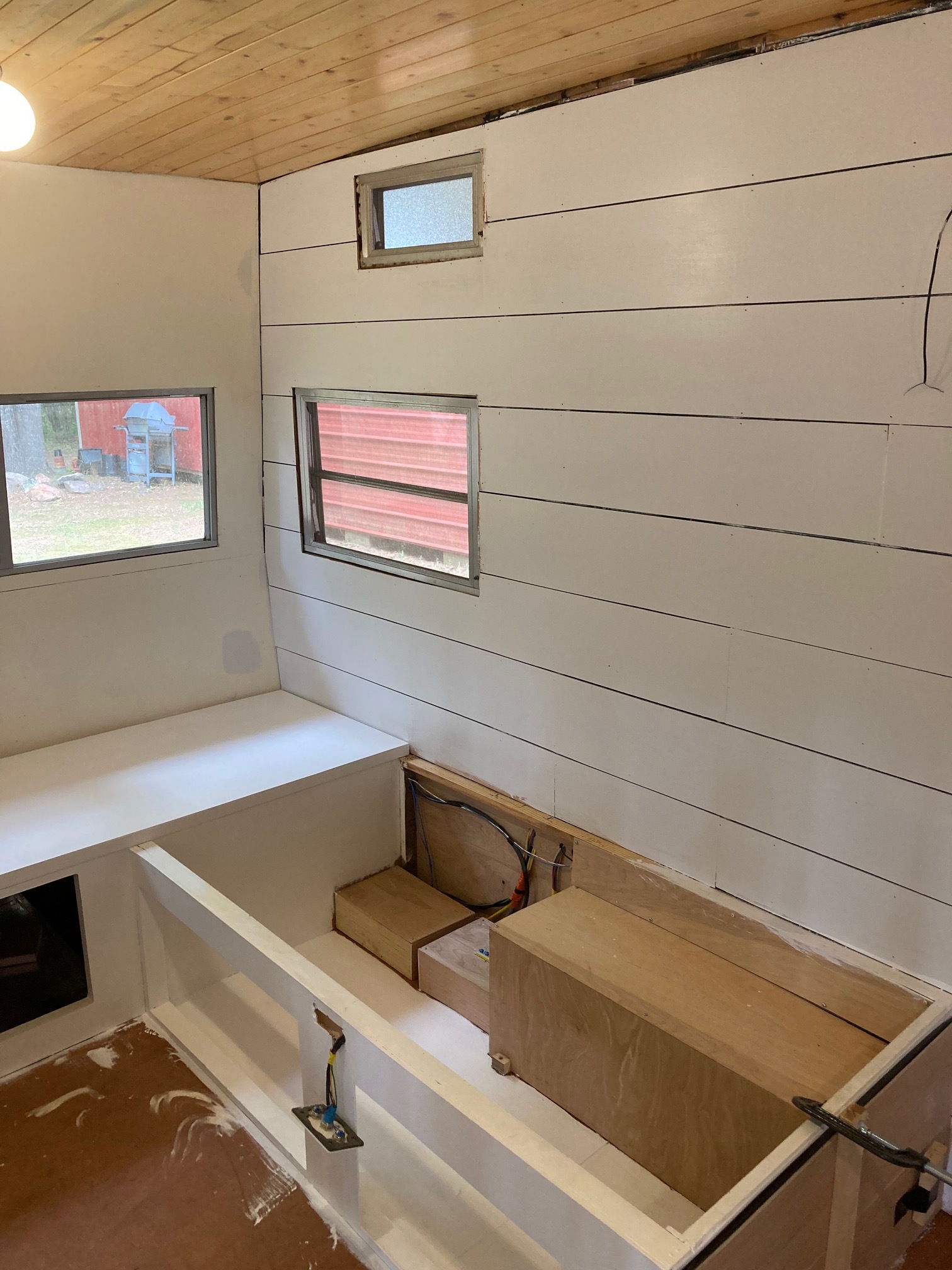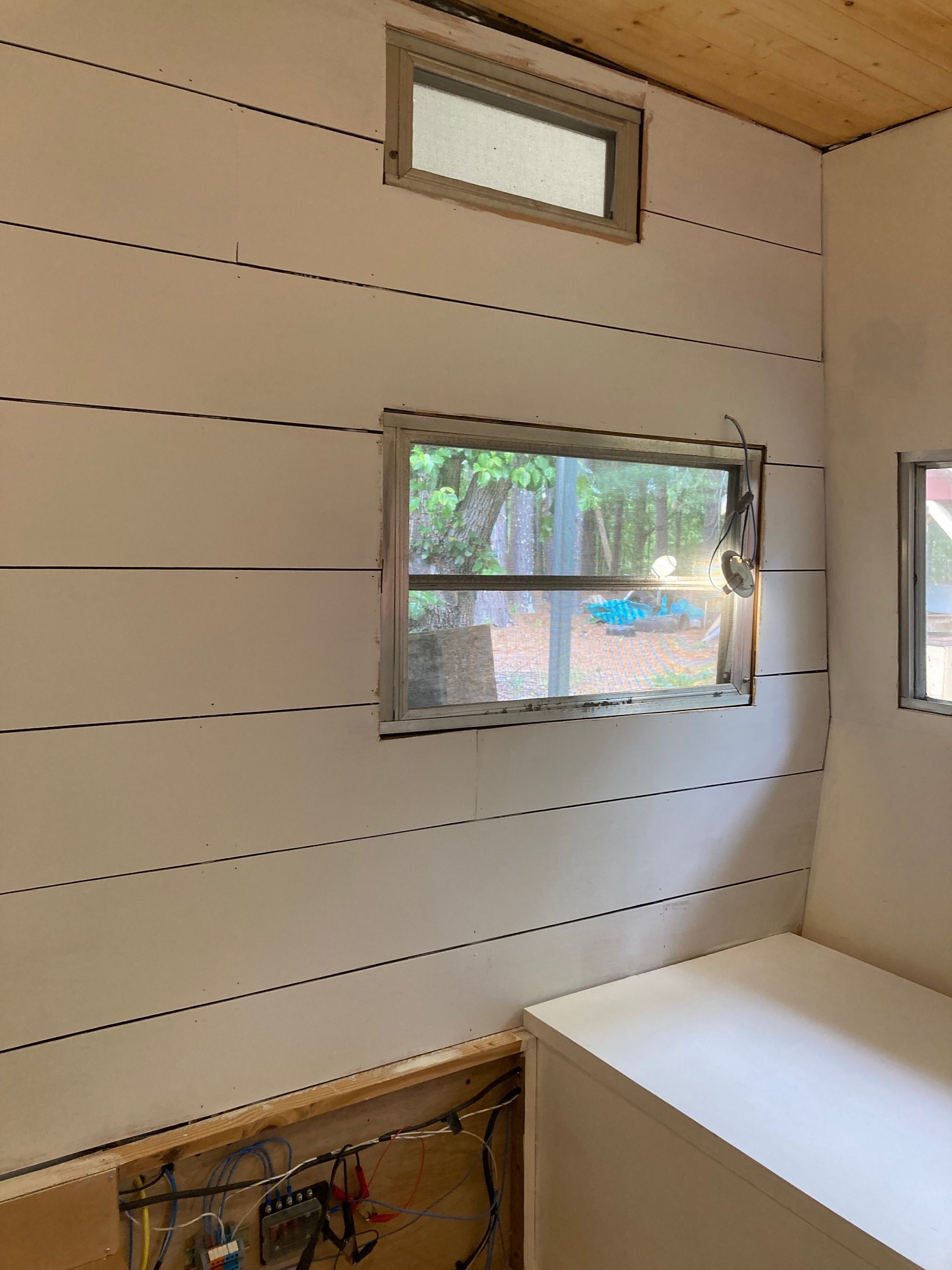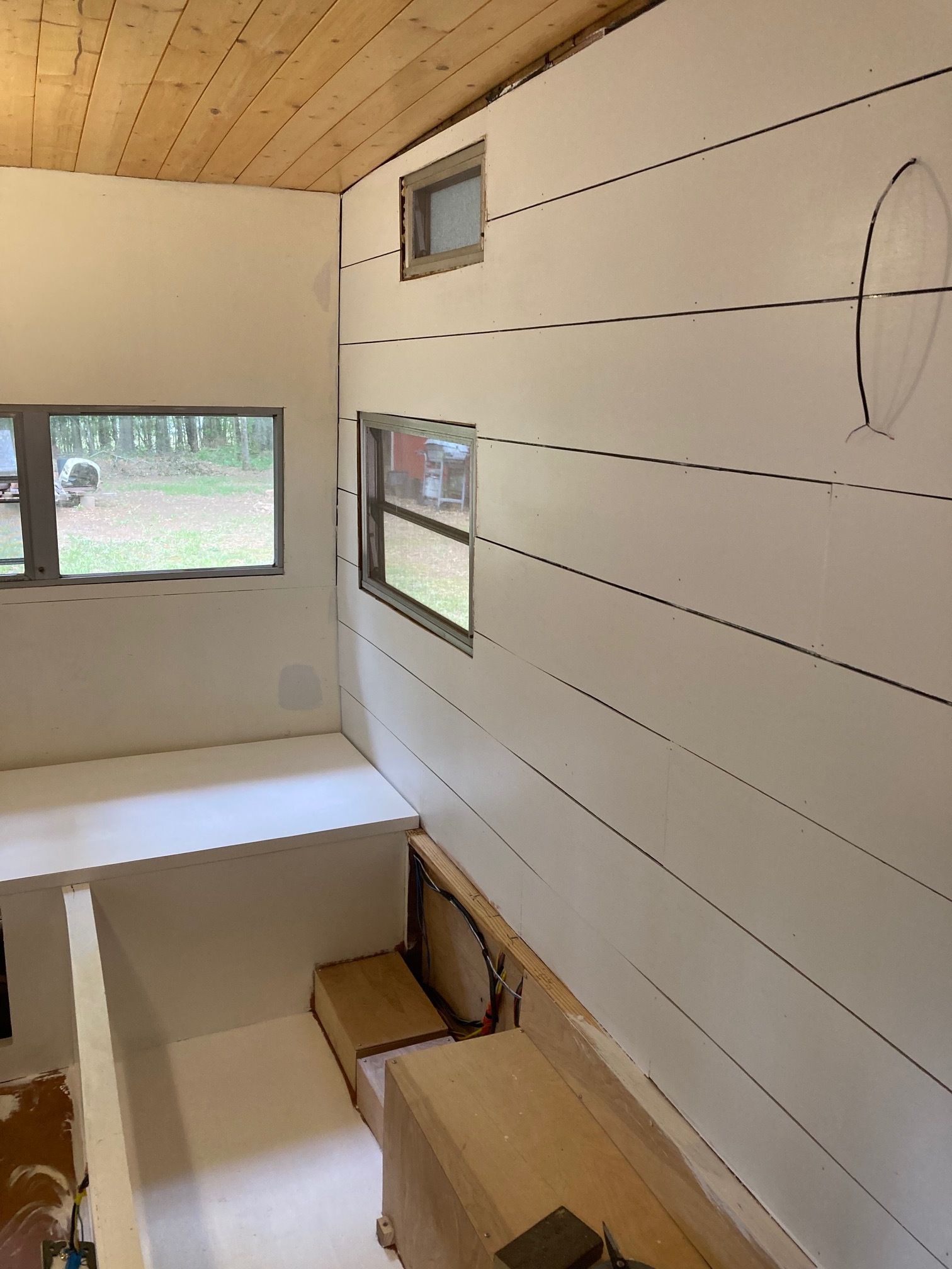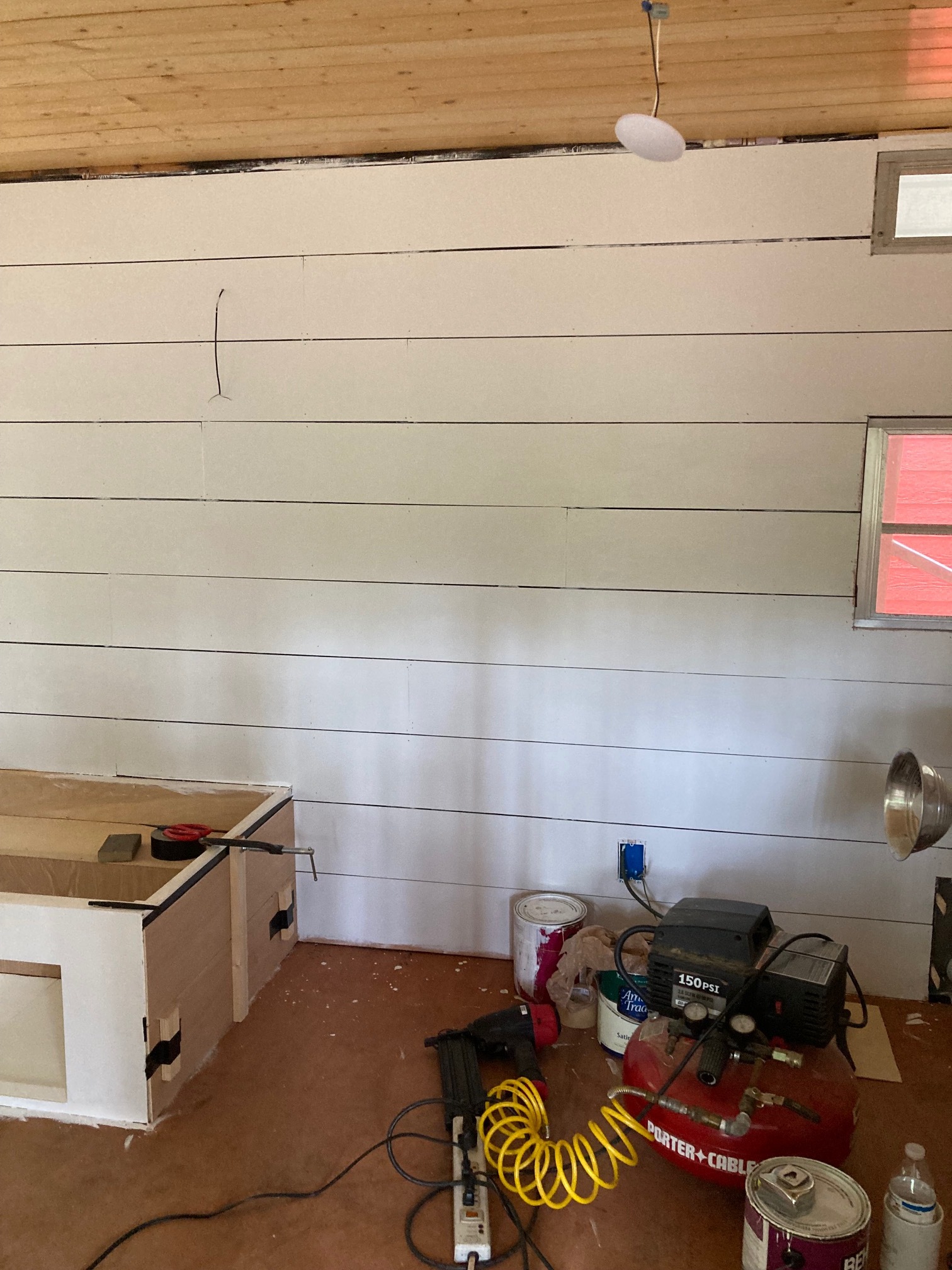 ID:	20474 Got some work done on the walls.Ripped some 5mm plywood into 7.25 inch wide strips to create a ship lap look.Got first coat of paint on. Click image for larger version