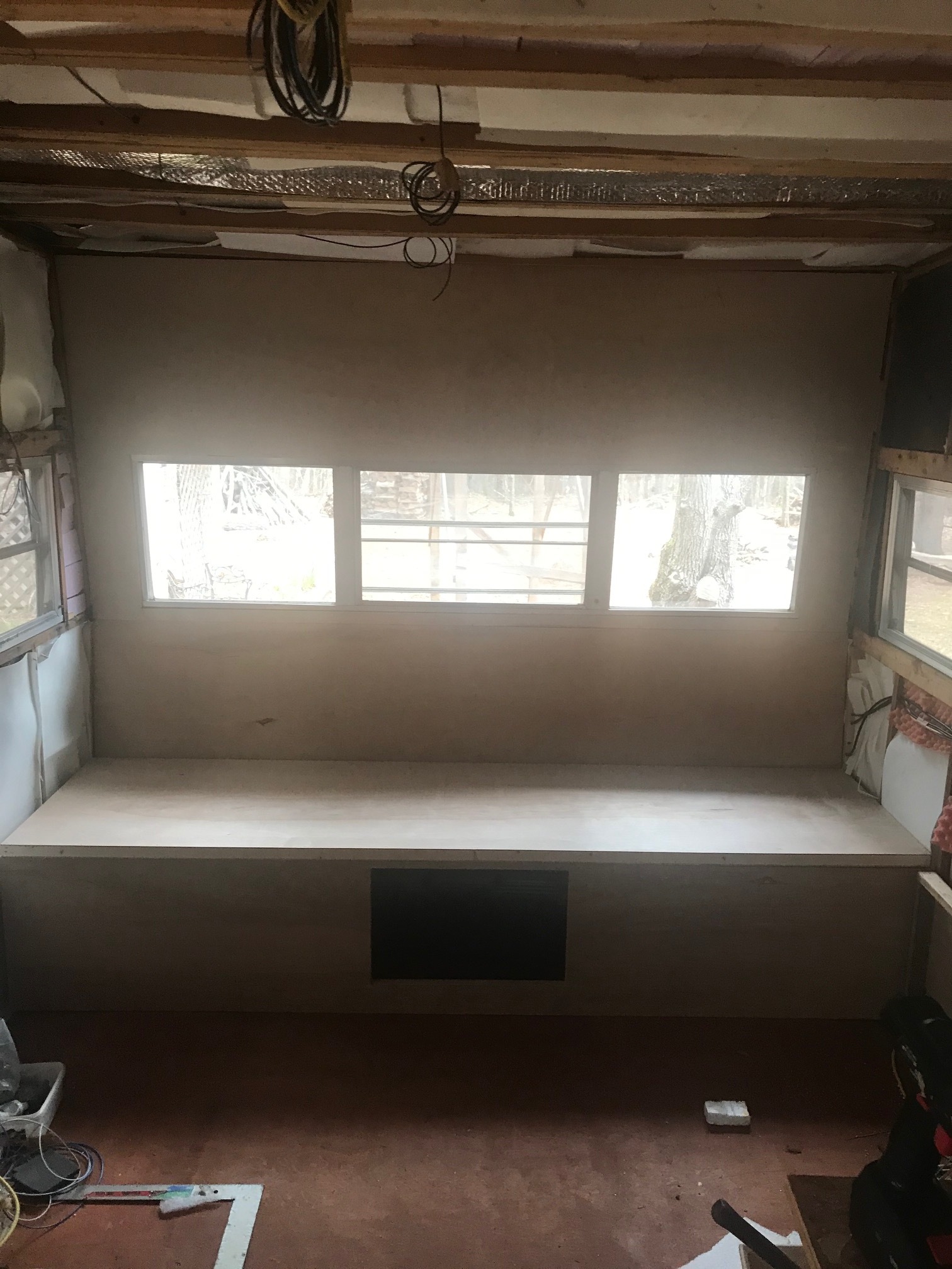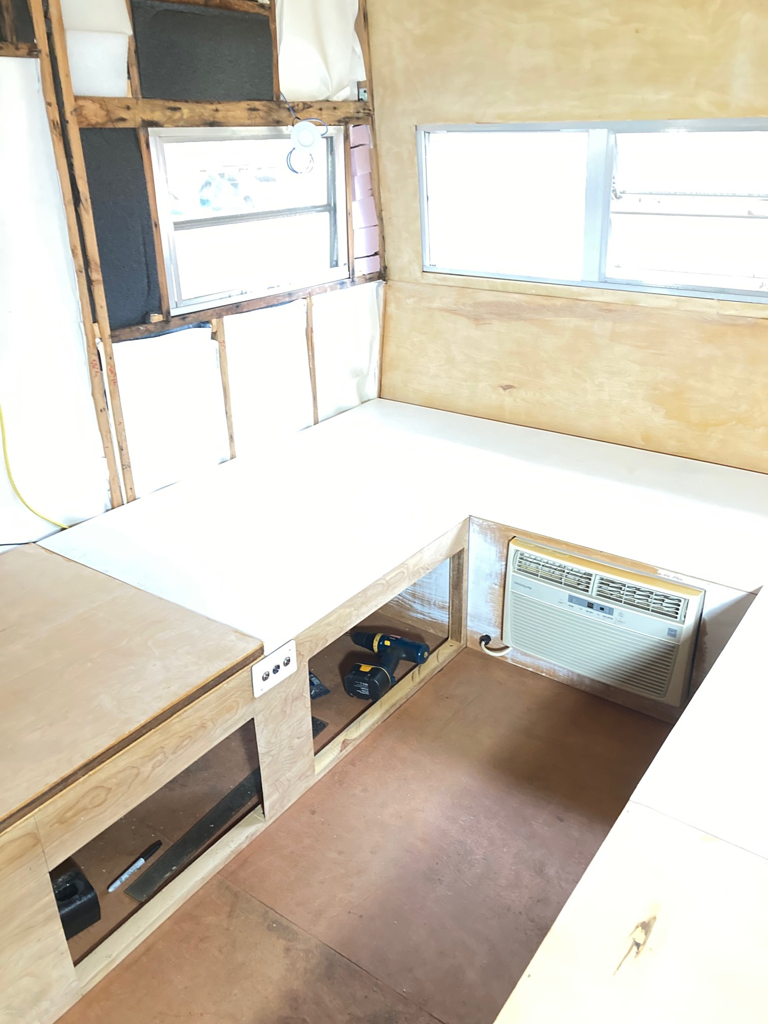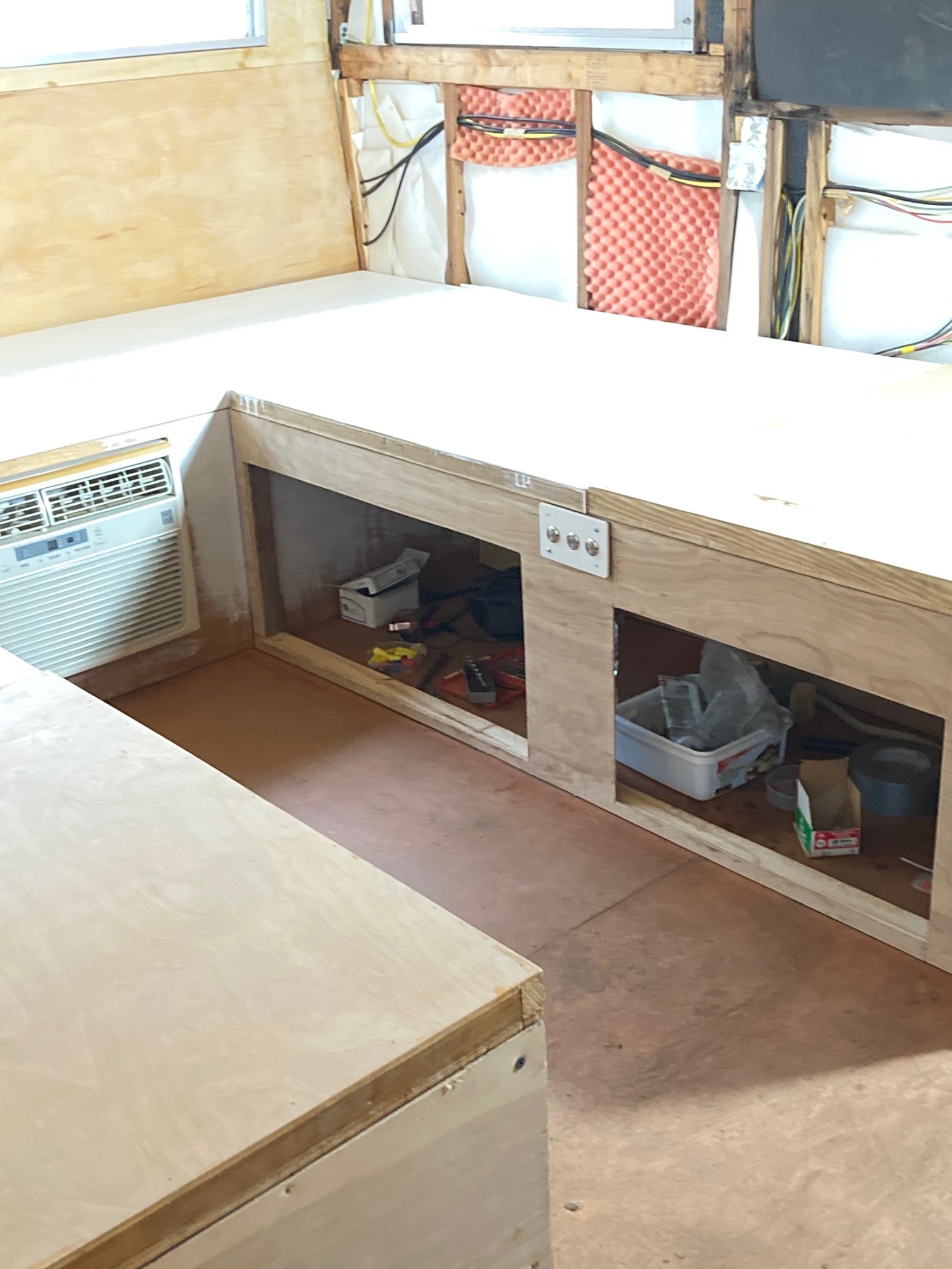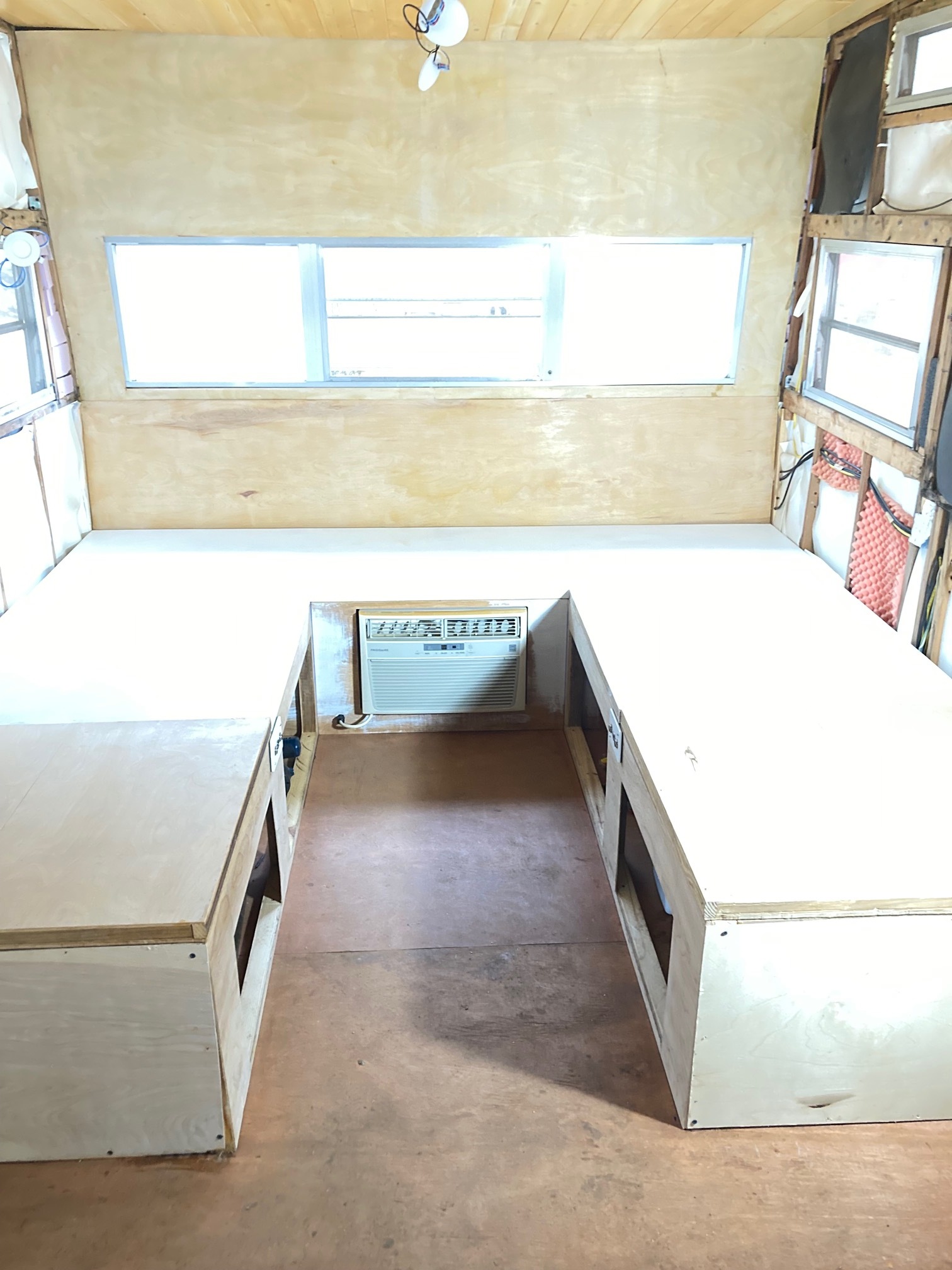 Click image for larger version  Name:	IMG_6818.jpg Views:	0 Size:	732.2 KB ID:	10302 Plan is to build 30" x 78" bed on each side facing to back.The foot end of beds goes all the way across and will have the air conditioner mounted in opening between the beds,Building it in sections to be assembled as one unit.The panels are sandwiched 1" foam covered with 1/8 inch luan on both sides.Pretty light weight for the size.