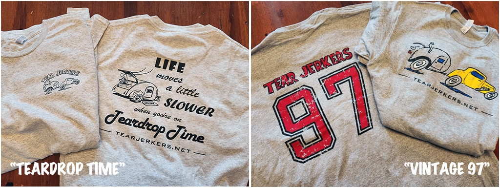 I have a limited selection of gray unisex short sleeve t-shirts available in both the "Teardrop Time" and "Vintage 97" designs leftover from our last online store. Shirts are Jerzees brand, screenprinted in my town by a local small business. Quality is top notch!